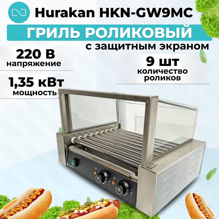 ГРИЛЬ ДЛЯ HOT DOG HURAKAN HKN-GW9MC С ЭКРАНОМ — профессиональный гриль для жарки сосисок, сарделек и мясных рулетов на предприятиях общественного питания и торговли. Основная задача модели — быстрое и качественное приготовление цилиндрических мясных продуктов. Особенности включают в себя защитные экраны, предохраняющие персонал от возможного попадания жира и масел, а также защиту от случайных прикосновений к горячим элементам.