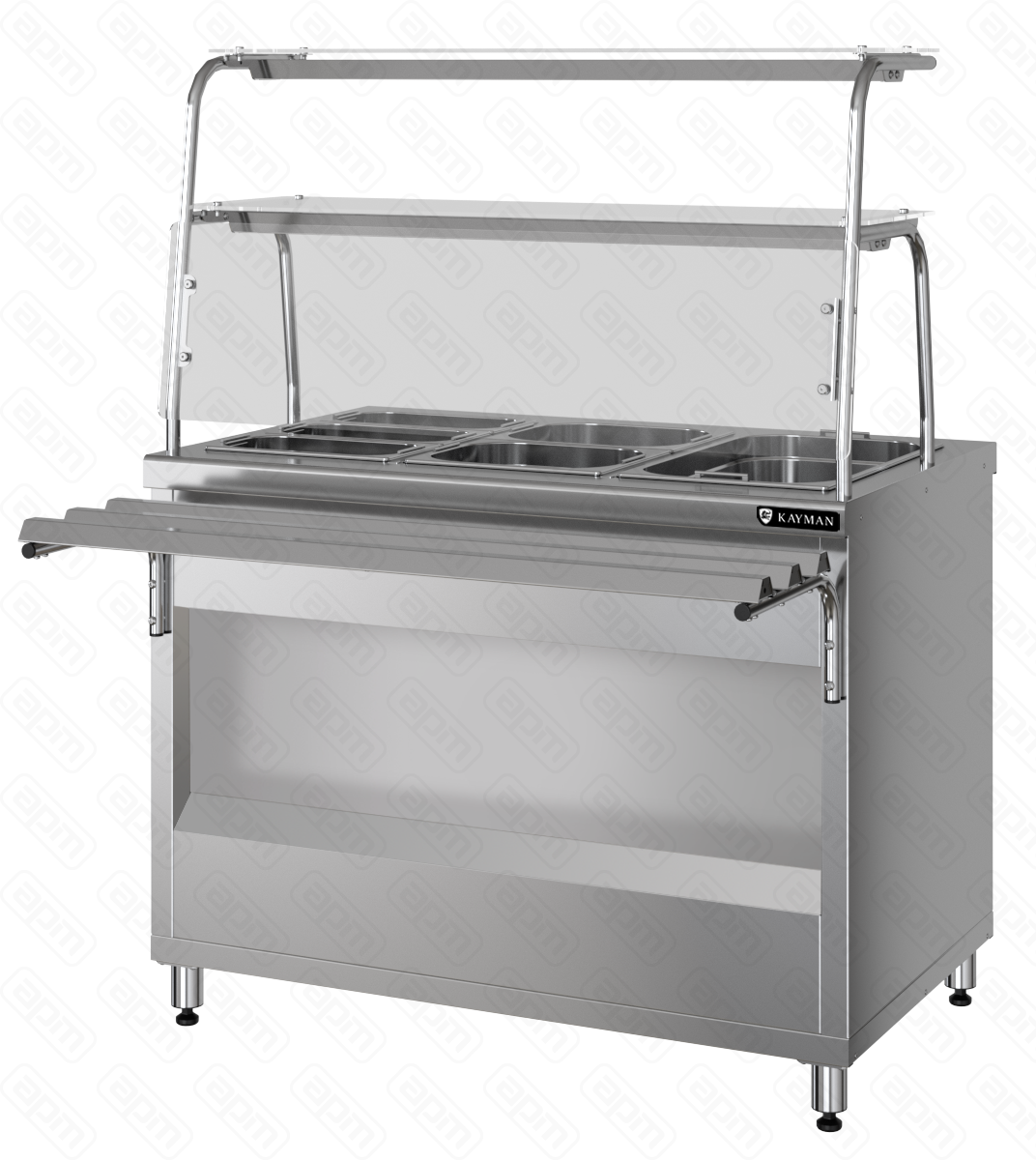 1120x705 (1030)x870 (1484)мм. 230В, 2,409кВт. Площадь поддонов и полок для выкладки продуктов 0,66 м2. паровой, диодная подсветка, 6 комплектов гастроемкостей с крышками,противокашлевый экран. 2 полки. Направляющие входят в комплект.