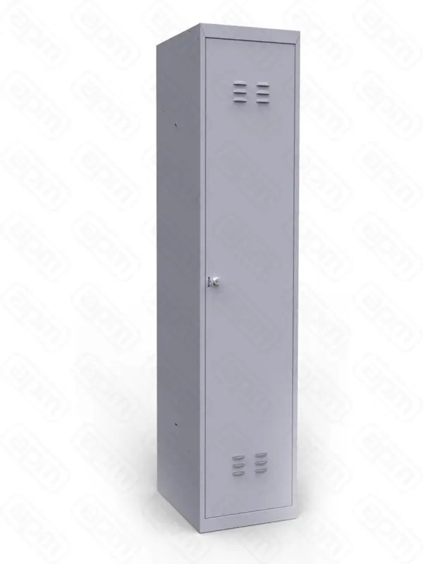 Односекционный металлический шкаф для одежды имеет внутреннюю комплектацию: полку для головных уборов, металлическую перекладину для вешалок и два пластиковых крючка для одежды, проушину для навесных замков.