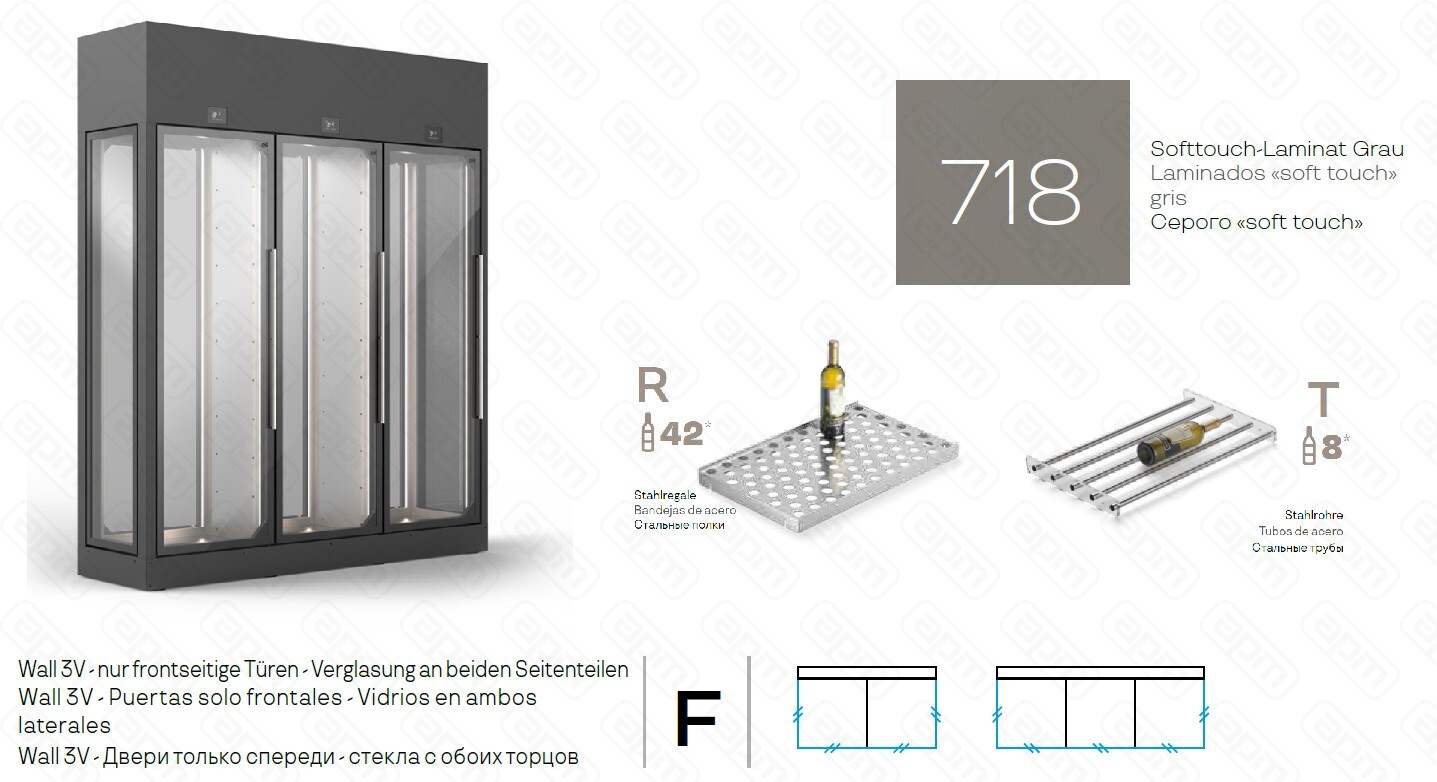 — В комплекте полки типа R (сталь, для вертикального размещения бутылок, вместимость 42 бутылки) - 10 шт, полки типа T (сталь, для горизонтального размещения бутылок, вместимость 8 бутылок) - 10 шт