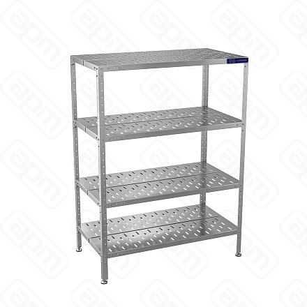 Стеллаж состоит их четырех сдвоенных перфорированных полок и четырех стоек, изготовленных из нержавеющей сталь AISI 430. Полки могут устанавливаться на разных уровнях. Ножки имеют пластиковую опорную часть и регулируются по высоте. Изделия разборные и поставляются в удобной упаковке.