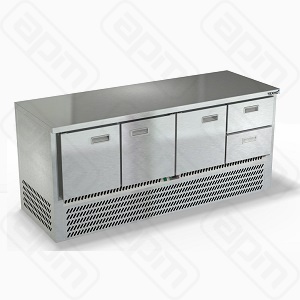 — Столешница и корпус из нержавеющей стали марки AISI 430 — Задняя панель из оцинкованной стали — Полезный объем стола: 202 л — Направляющие с доводчиками (Австрия) — Нагрузка на ящик: 35 кг — Компрессор (Испания) — Петля доводчик (Польша) — Нога опорная, регулировка 25 мм — Полка решетка регулируемая по высоте с шагом - 45 мм, гастронормированная, нагрузка: 35 кг