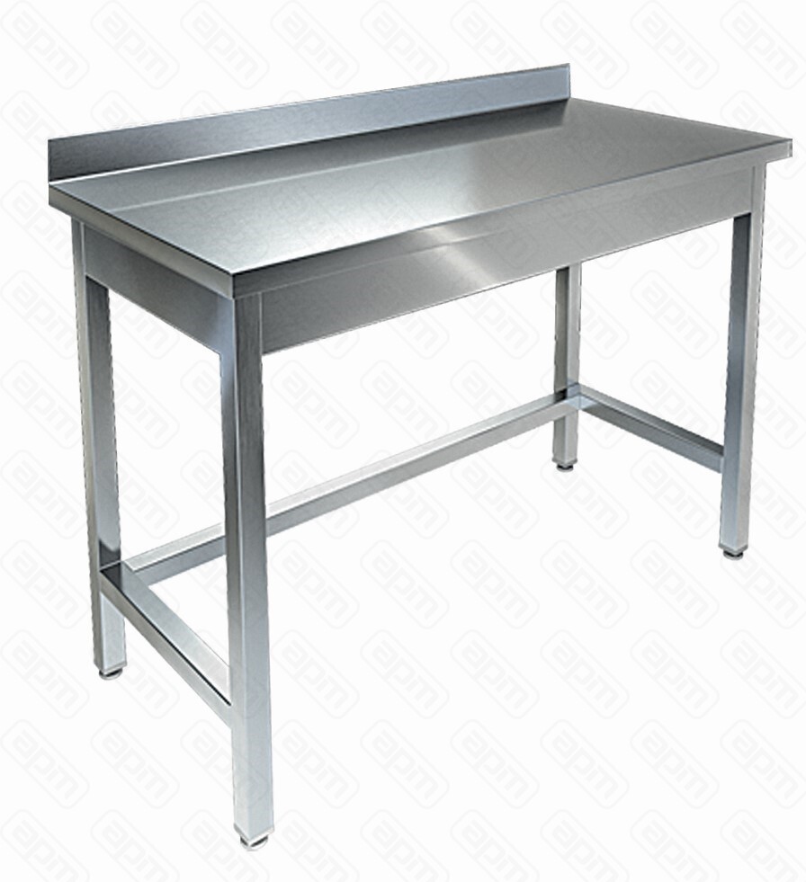 — Рабочая поверхность: AISI 430 0,8 мм — Усиление ЛДСП 16 мм — Борт 70 мм — Каркас: труба 40х40 мм из нержавеющей стали AISI 430 1,2 мм — Верхняя обвязка — Нижняя обвязка с трех сторон — Регулируемые по высоте опоры — Разборный