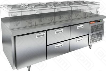 Конструкция стола включает в себя стальную столешницу, трехсекционную морозильную камеру.