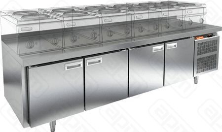 Конструкция стола включает в себя стальную столешницу, четырехсекционную морозильную камеру.