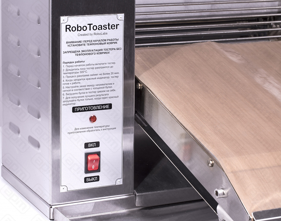 RoboToaster — специализированный тостер для подогрева и поджарки булочек, предназначенных для бургеров и хот-догов. Подходит для использования на предприятиях общественного питания и торговли. Управляемая конструкция из нержавеющей стали AISI 430 обеспечивает долговечность и простоту обслуживания. Коврики из тефлона защищают контактные поверхности от износа, а сетка из нержавеющей проволоки диаметром 4 мм формирует равномерный тепловой поток. Электромеханическое управление позволяет удобно регулировать температуру нагрева и высоту расположения нагревательных элементов.