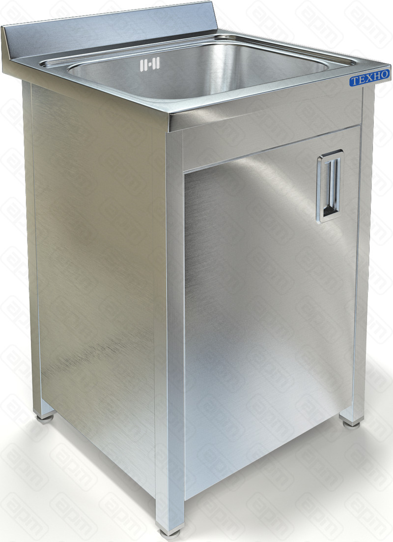 500х600х850мм, Одна цельнотянутая емкость размером 400х400х250 из нержавеющей стали марки AISI 304 толщиной 1мм, обнижение 2 мм. Объемный пристенный борт высотой 70мм. Корпус из трубы 40х40 нержавеющей стали марки AISI 304 толщиной 1,2мм.и боковых панелей из нержавеющей стали марки AISI 304 толщиной 0,8мм. Одна распашная дверь, полка. Ванна комплектуется выпуском с нержавеющей решеткой и механическим запорным клапаном, диаметр выпуска 90мм, диаметр подключаемого сифона 50мм, перелив, регулируемые опоры. На дно ванны нанесена виброшумоизоляция. Ванна поставляется в собранном виде.